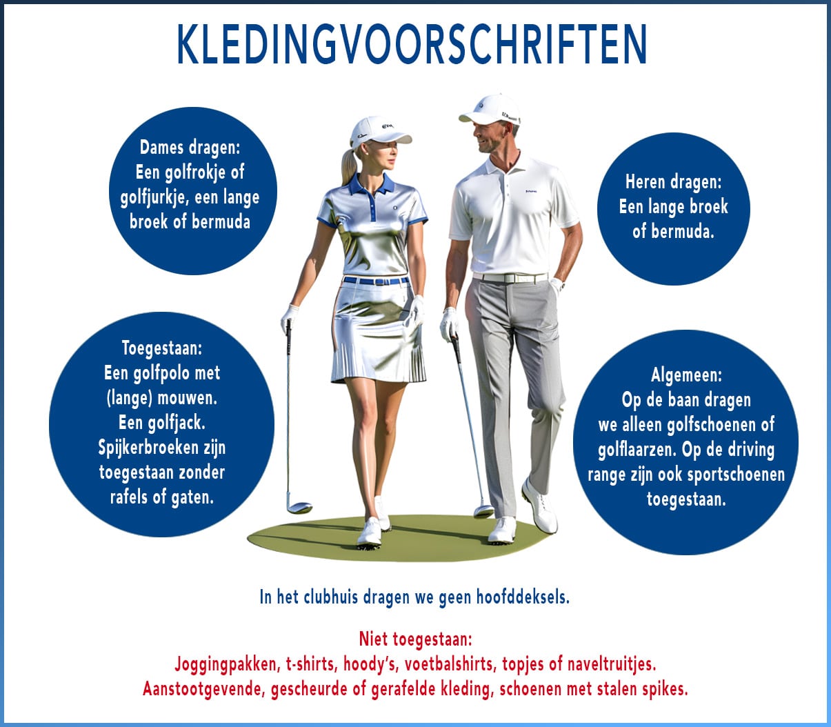 Spelers zijn te allen tijde verantwoordelijk voor hun eigen veiligheid. Je betreedt de golfbaan op eigen risico. Je lichaamlijke conditie kan aanleiding zijn om extra voorzichtig te zijn op dagen dat het erg warm is.